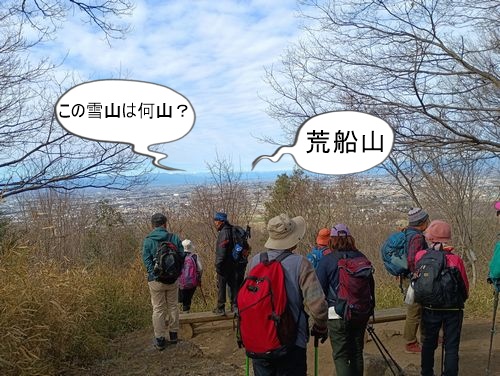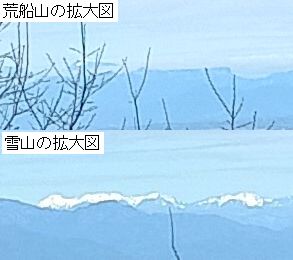 南公園から出発し登り出しがきつかったが、しばらくして見晴らしの良いところに出た。遠くに見える雪山は誰かが「あれは八方だよ」といっていた気がしたので写真を撮った。写真を拡大したら雪山の右方には荒船山が判別された。これは特徴的なので間違いなし。