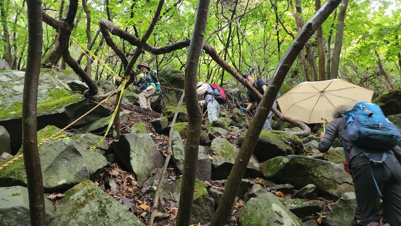 茅が岳は登下山ともに一本調子で標高差750m、我が会にしては厳しめの山でした。雨まで降り始め谷筋の急登はぬかるみ、休む場所もなく難儀しました。漸く尾根道に出て深田久弥氏の記念碑を拝む頃、元気を取り戻し精鋭8人揃って頂上へ。ガスで眺望はゼロでしたが、バスで延々3時間掛け、急登の道を2時間の苦闘を超えた達成感に包まれました。帰路は尾根筋をのんびり下って、お風呂とお酒が待つ石和温泉へ行きました。